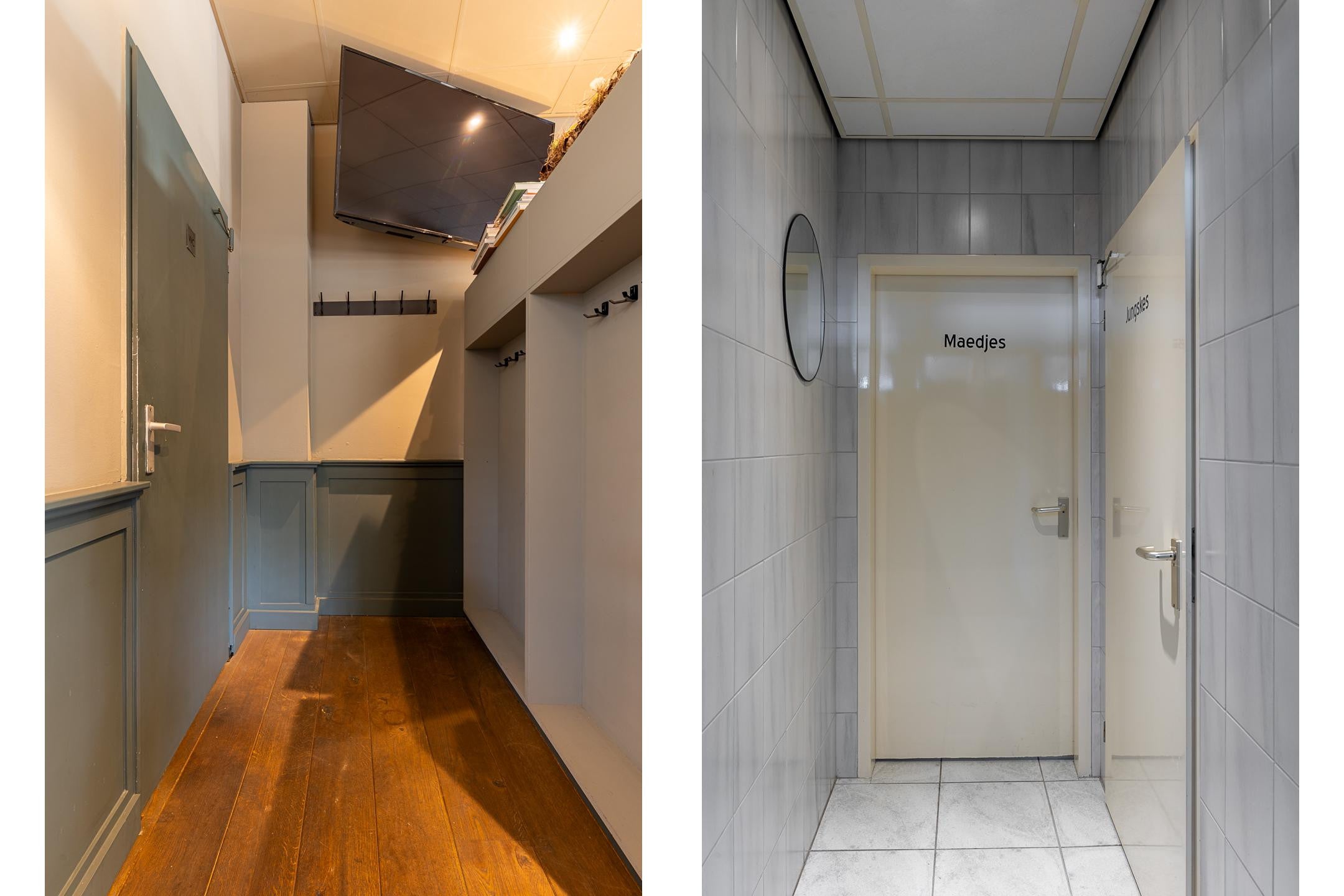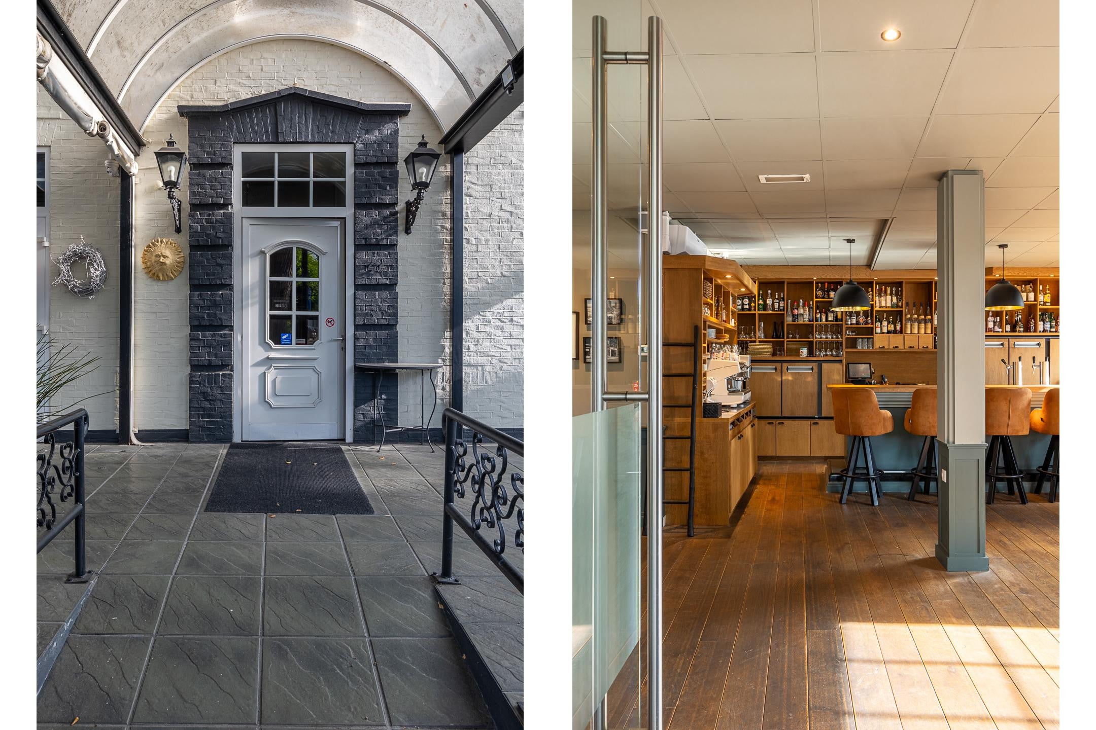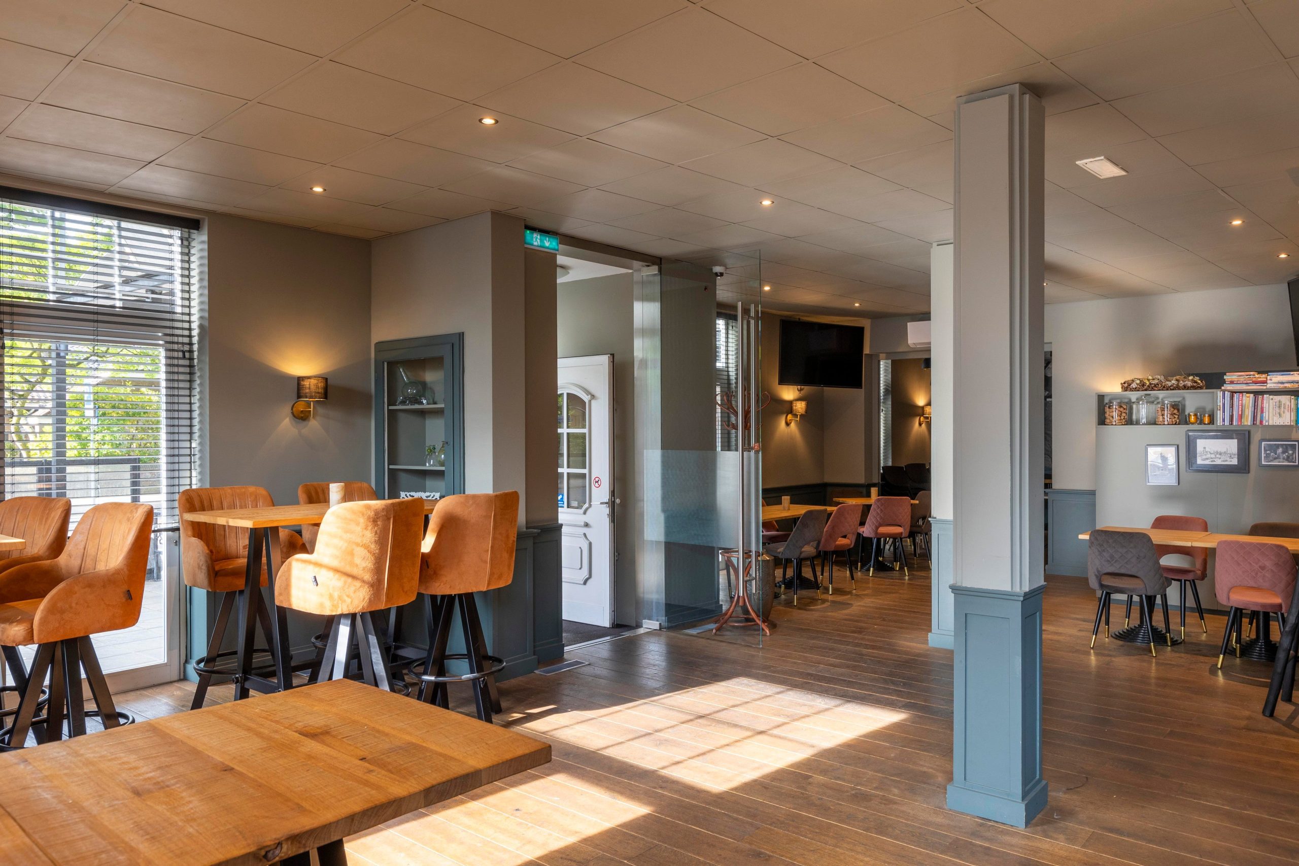 Hal/entree, ruim restaurantgedeelte met een complete bar circa 80m2 groot, houten plankenvloer, airco’s, keurig heren en dames toiletten. Ruim overdekt en verwarmd buitenterras aan de straatzijde, zonder precario-of huurverplichtingen aan de gemeente. RVS horeca keuken voorzien van alle benodigde apparatuur plus opslagruimte met een koelcel.
