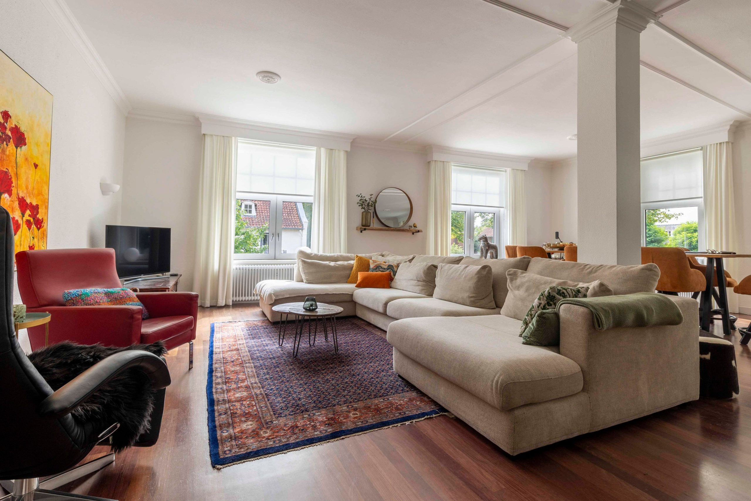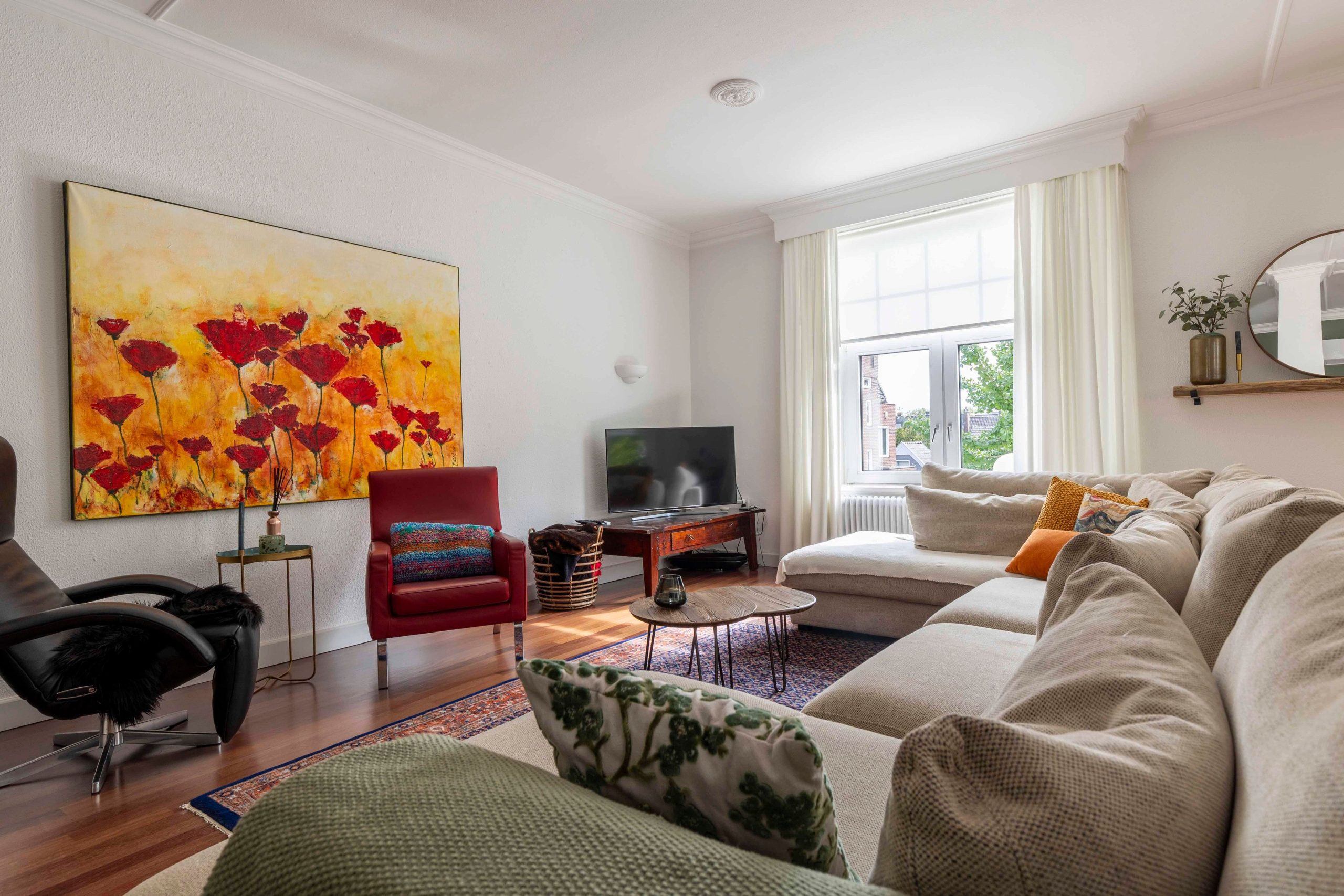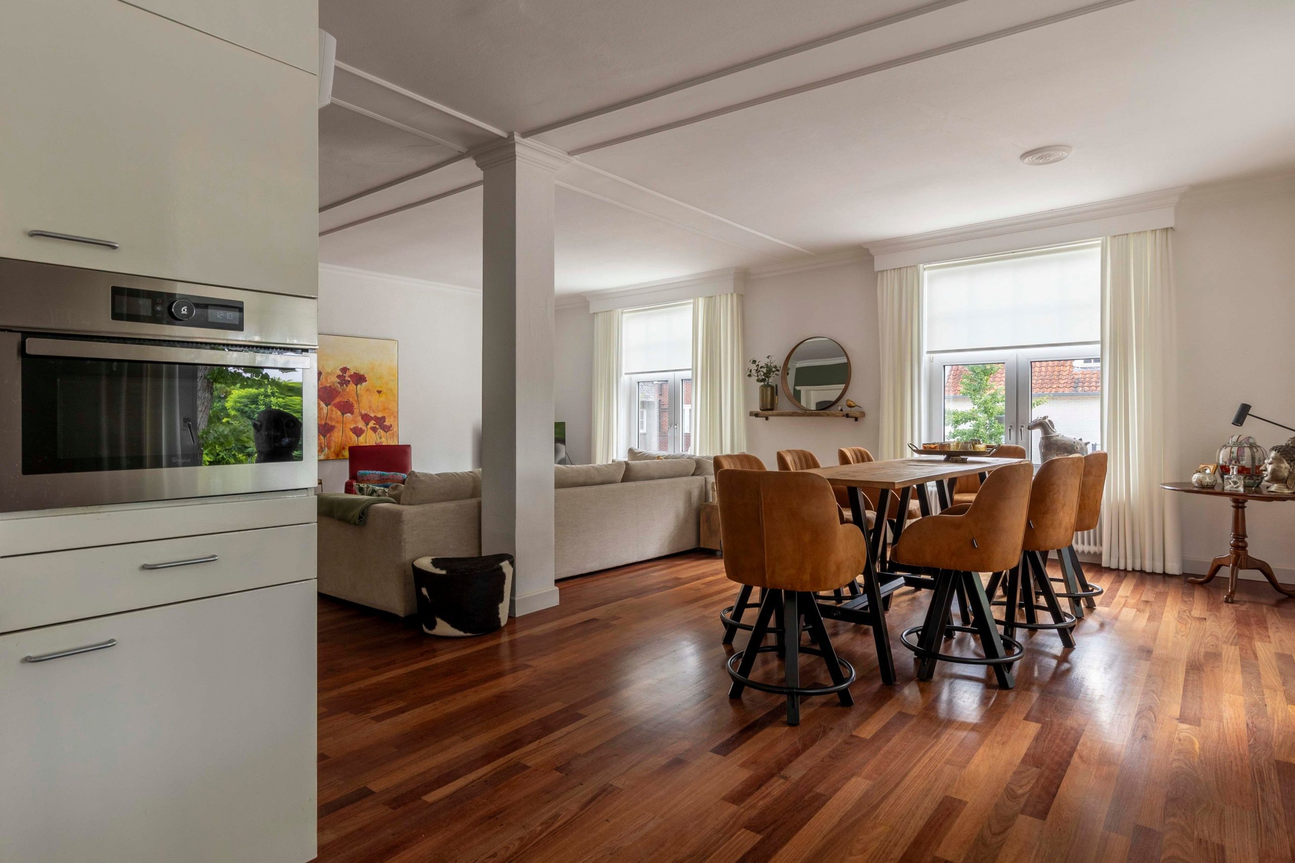 Zeer ruime bovenwoning met 2 slaapkamers, keuken, eetkamer, woonkamer, tuinkamer en dakterras.