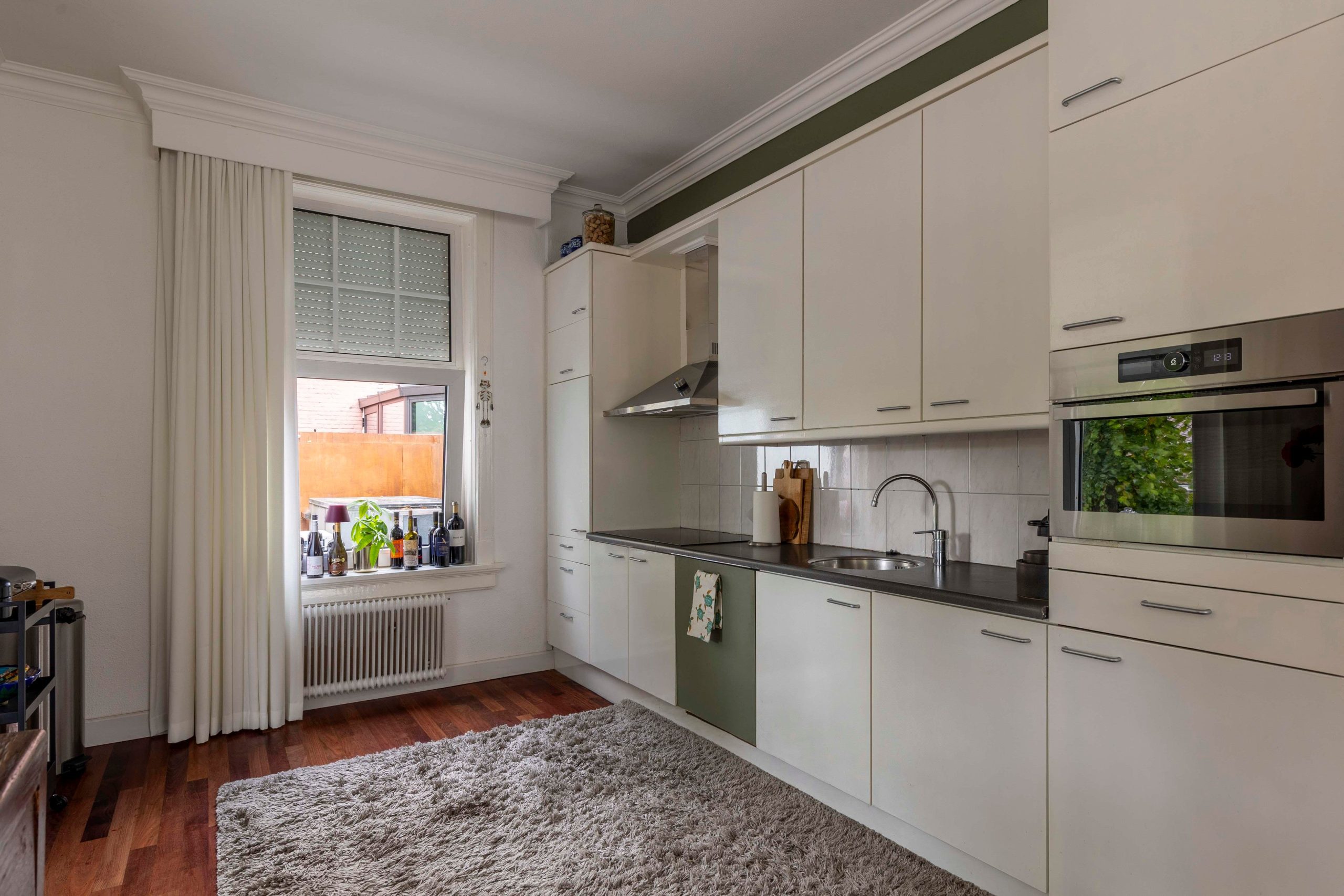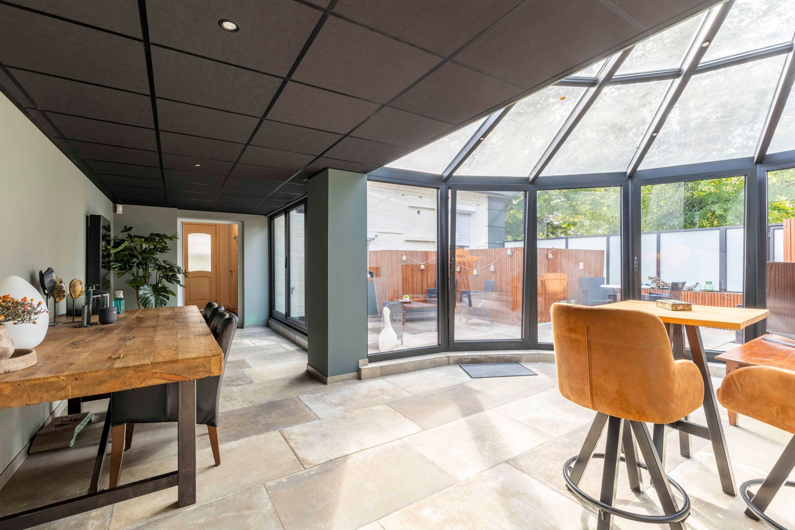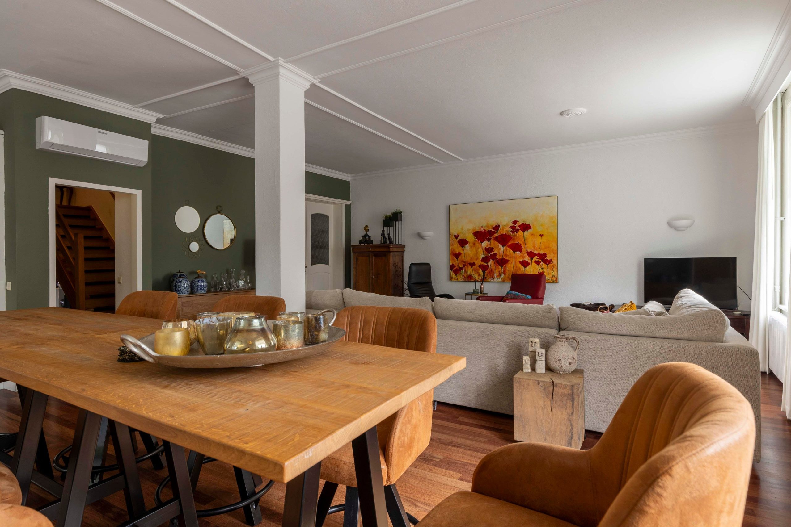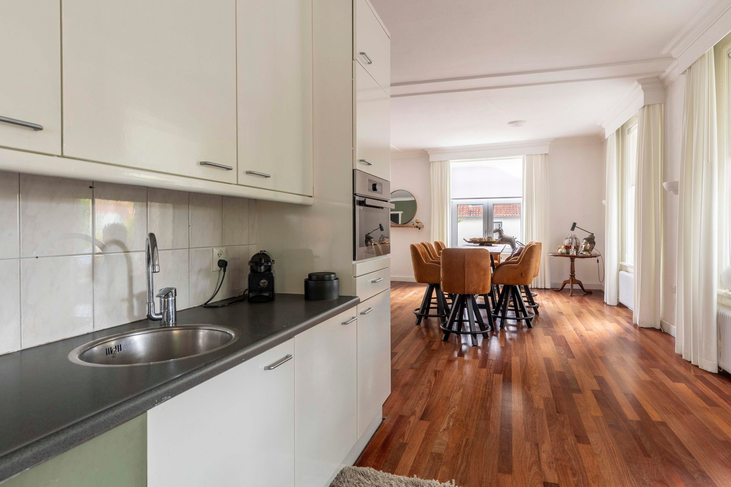 Zeer ruime bovenwoning met 2 slaapkamers, keuken, eetkamer, woonkamer, tuinkamer en dakterras.