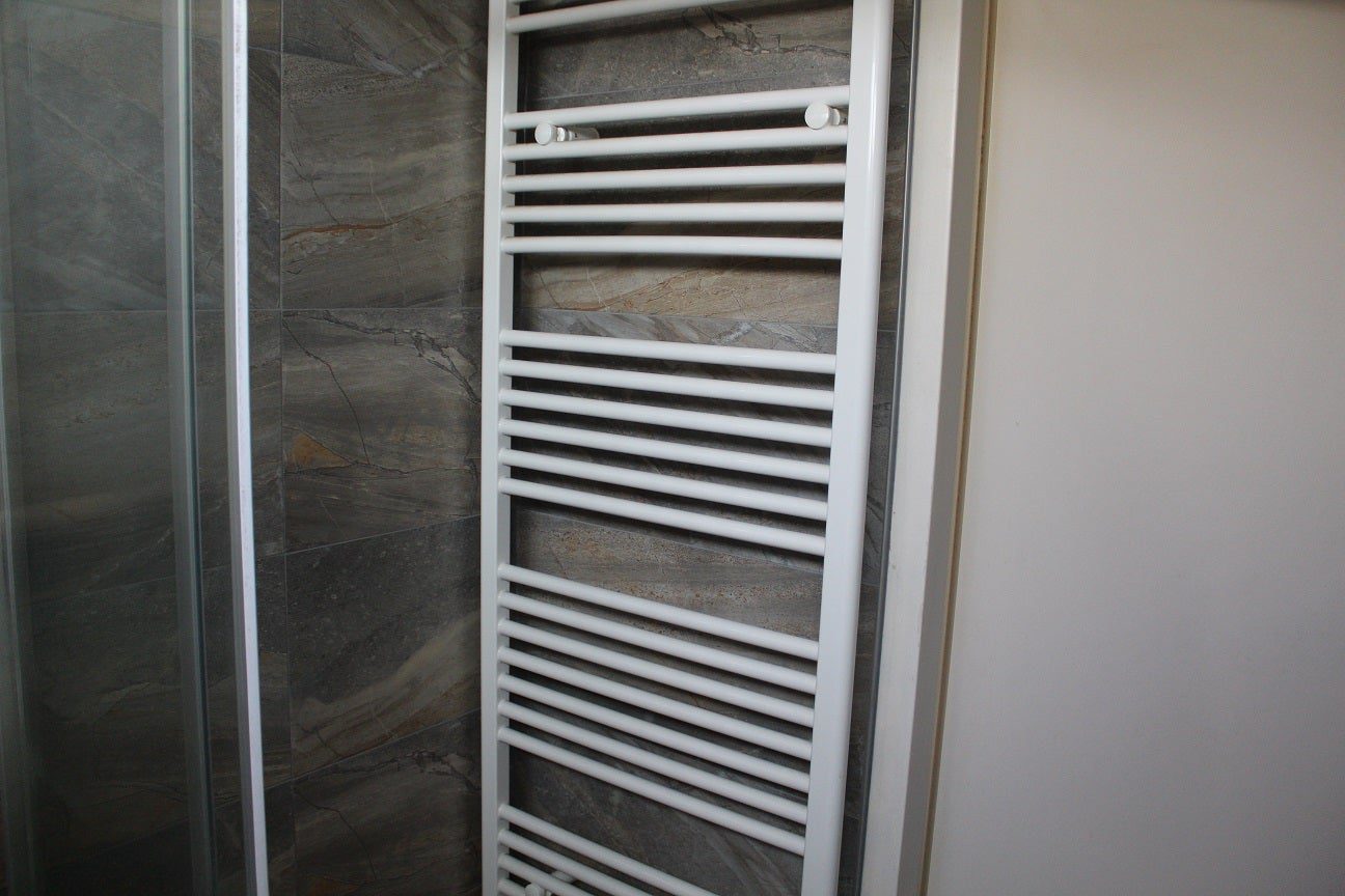 Geheel betegelde badkamer met douche, toilet, een wastafel in een meubel en de wasautomaat aansluiting.