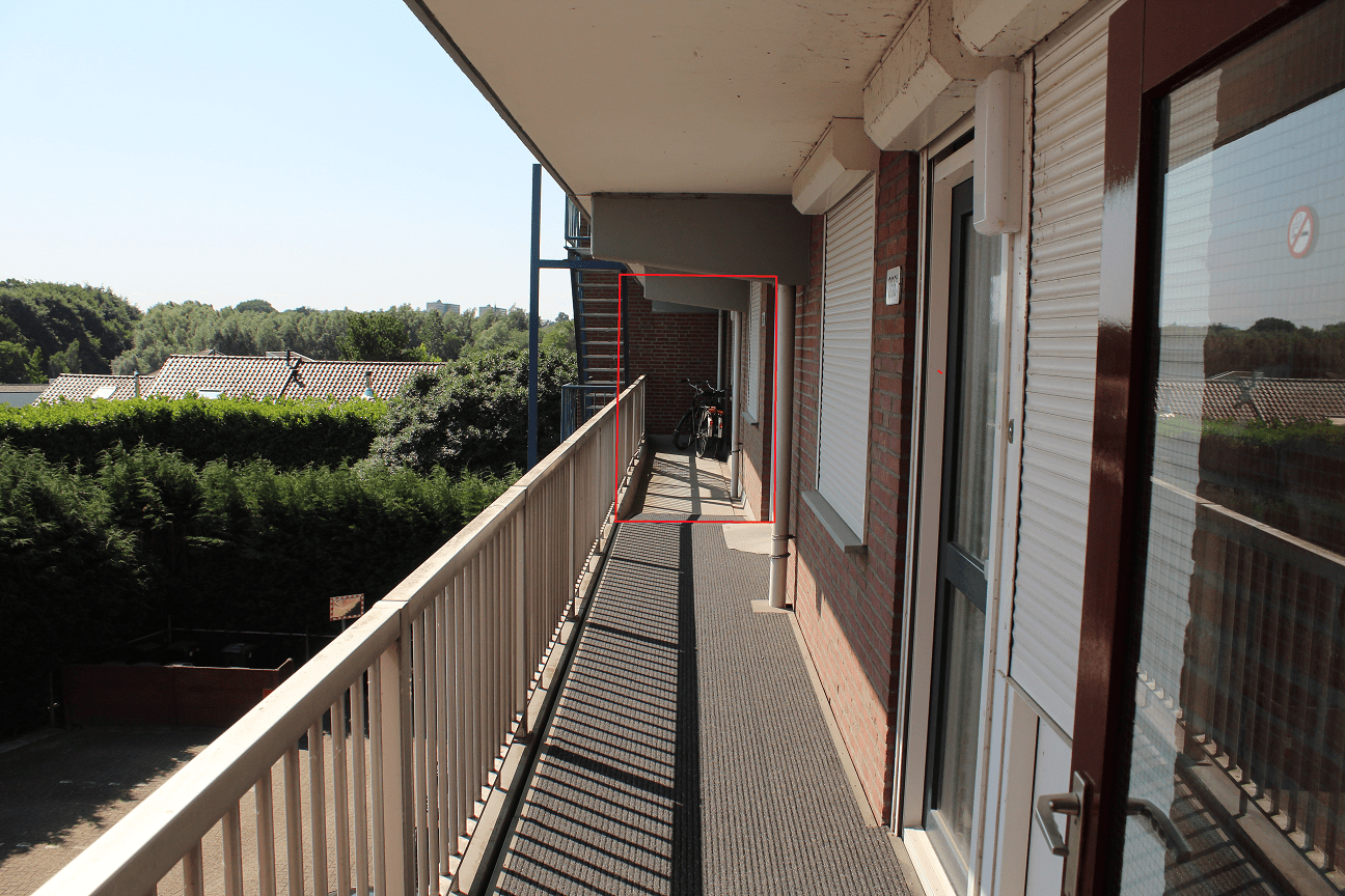 Balkon (Resp.2.70m x 1.83m=4.94m2) voorzijde appartementencomplex.